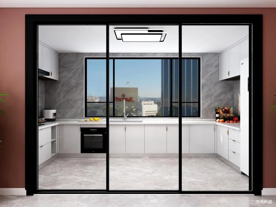 厨房是南北通透的U型空间布局,功能齐全且合理衔接,纯白的柜体让视野更开阔,用透明玻璃门隔断,极大的提升了生活的品质。