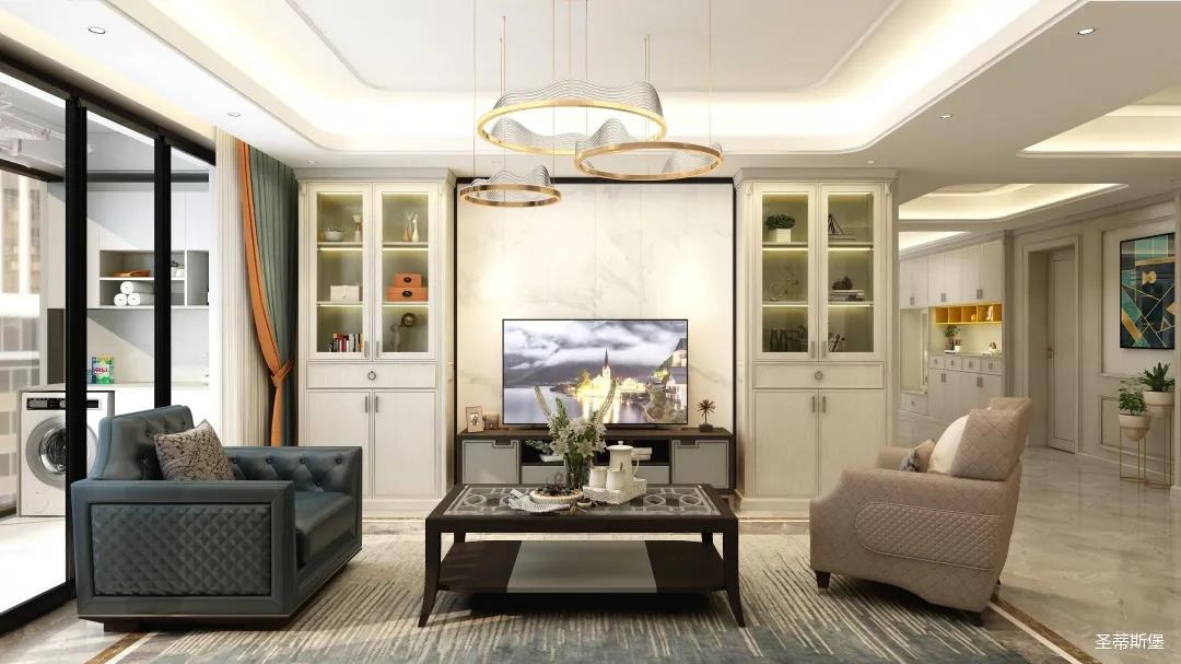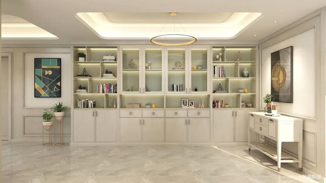 ▲?电视背景墙设计师完全根据业主家量尺所得,安装的对称装饰柜,集装饰美与实用性于一体,业主超喜欢收藏,设计师也完全满足了业主对空间储物的需求。