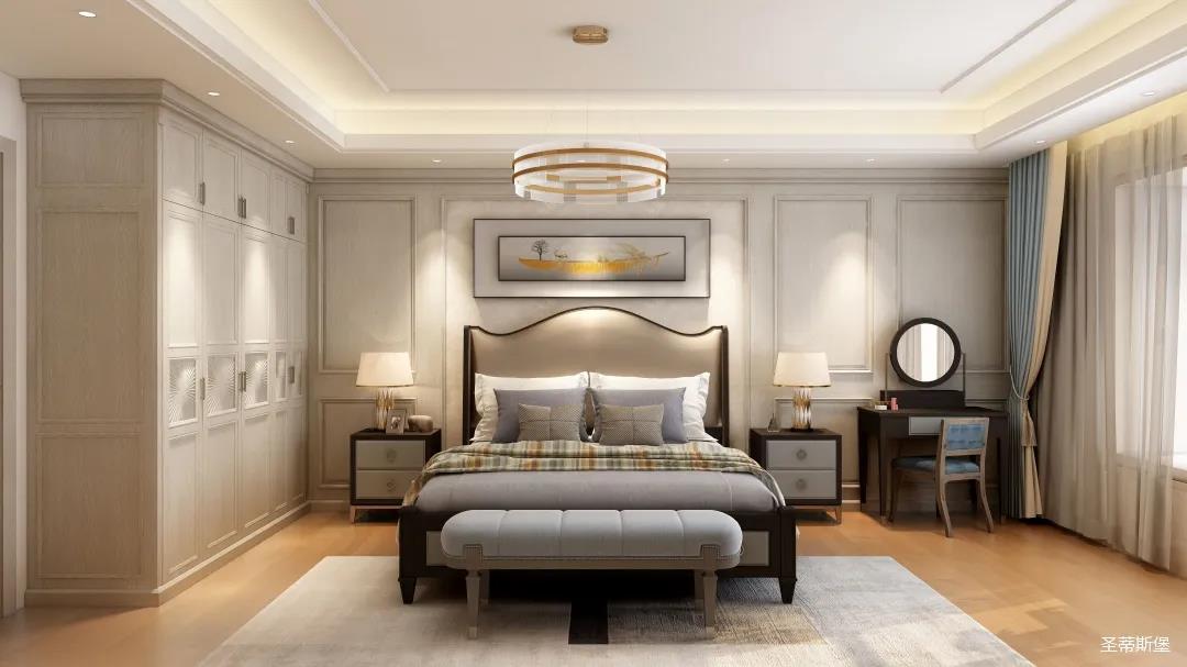 ▲业主喜欢低调轻奢的空间格调,设计师从功能出发,赋予空间舒适的感受,打造专属的衣帽间,满足业主日常买买买的储物喜好。同时也将艺术元素融入美式现代风格,利用空间的色彩、纹理、家具、配饰、光线等表达空间情绪,再以黄铜金属加持,营造温馨惬意的家居睡眠氛围。