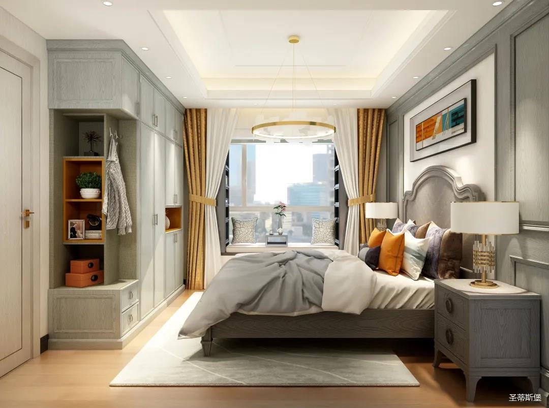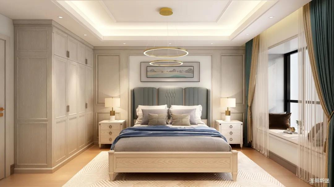 ▲卧室是居家的主要休息场所,在设计上需更注重舒适度。所以房间就以和谐淡雅的色彩为主,采用素雅柔和的线条布局,时尚轻奢的家具,使得空间更加的惬意和浪漫。床头层林尽染装饰画,让原本略偏美式淡雅的卧室在色彩上更添一笔。